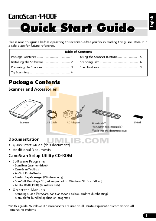 The lack of an instruction or false information given to customer shall constitute grounds to apply for a complaint because of nonconformity of goods with the contract. Guide de demarrage rapide schnellstart referenz guida rapida allinstallazione. Canoscan 4400f box contents canoscan 4400f box contents canoscan 4400f ac adapter usb cable film guides35mm negatives35mm mounted slides documentation kit.